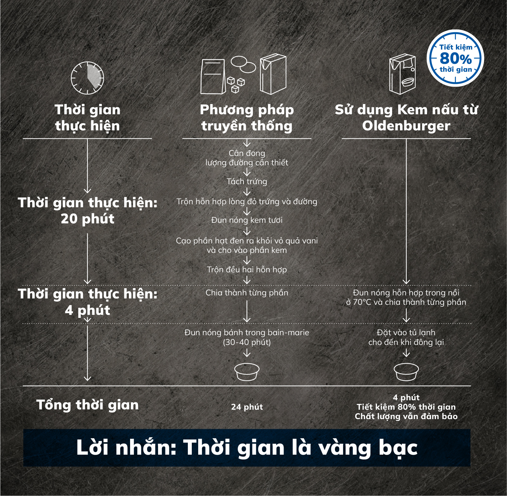 Sản phẩm Kem nấu món tráng miệng Crème Brûlée giúp tiết kiệm "thời gian vàng bạc" của bếp trưởng nhưng vẫn đồng thời đảm bảo chất lượng và hương vị đồng đều. Nếu theo phương pháp truyền thống, việc chế biến Crème Brûlée cần đến 25 phút thực hiện, thì nay với giải pháp tiện lợi từ Oldenburger, bạn có thể tiết kiệm đến 80% thời gian. Sản phẩm chỉ cần hâm nóng và chia ra khuôn, giữ lạnh & sau đó khò lửa trước khi phục vụ. Vậy là Crème Brûlée đã sẵn sàng chiêu đãi các thực khách!
